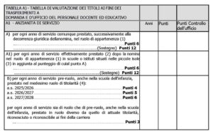 • titolari nella scuola dell’infanzia: gli anni di servizio pre-ruolo (di ruolo) prestato nella scuola secondaria di primo grado/secondo grado si valutano 3 punti per i primi quattro anni e 2 per i successivi, fermo restando che gli anni di pre-ruolo svolti nella scuola dell’infanzia sono valutati come detto sopra (4 punti nel 25/26, 5 punti nel 26/27, 6 punti nel 27/28);