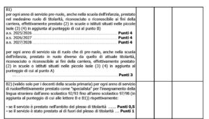 • titolari nella scuola primaria: gli anni di servizio pre-ruolo (di ruolo) prestato nella scuola secondaria di primo grado/secondo grado si valutano 3 punti per i primi quattro anni e 2 per i successivi, fermo restando che gli anni di pre-ruolo svolti nella primaria sono valutati come detto sopra (4 punti nel 25/26, 5 punti nel 26/27, 6 punti nel 27/28);