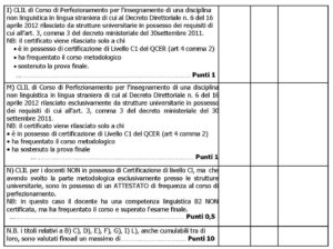 • sono attribuiti punti 1 per il possesso di certificazione CLIL di Corso di Perfezionamento per l’insegnamento di una disciplina non linguistica in lingua straniera. Il certificato, come si legge nel punto M) è rilasciato solo a chi: è in possesso di certificazione di Livello C1 del QCER; ha frequentato il corso metodologico; ha sostenuto la prova finale.